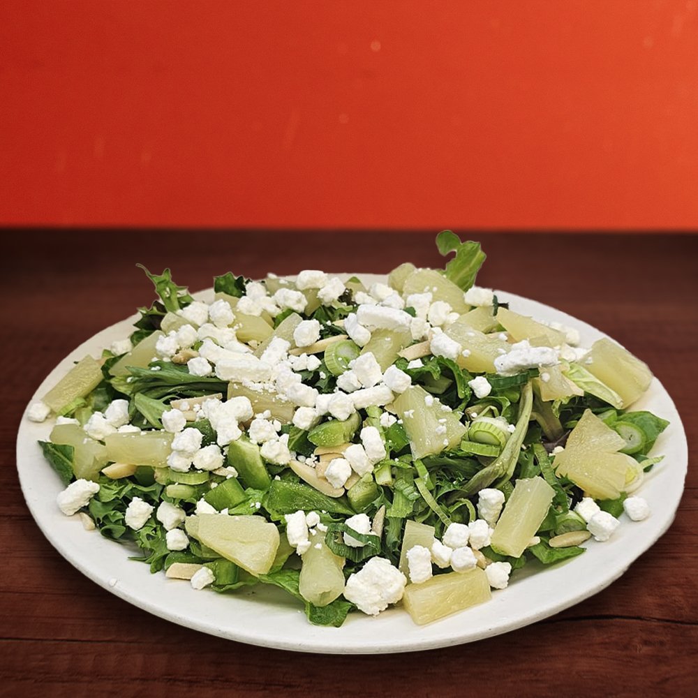 Romaine, Petite Red & Green Lettuce, Slivered Almonds, Pineapple, Green Pepper, Green Onion & Goat Cheese. Served with our Signature In-House Balsamic Dressing on side.
