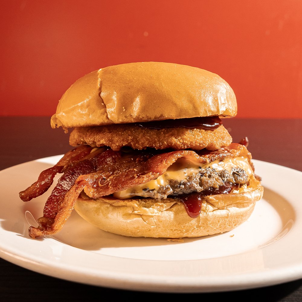 Charbroiled Patty, Bacon, Gourmet Onion-Ring, Cheddar Cheese, Mustard, Relish & Hickory BBQ Sauce.