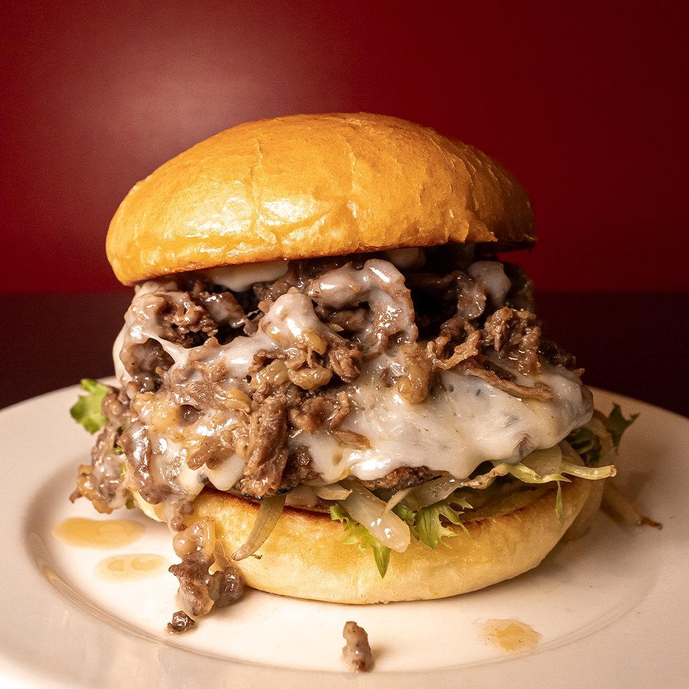 Thinly shaved Prime Rib, Charbroiled Patty, Pepper-Jack Cheese, Vous Sauce, Petite Red & Green Lettuce, Fried Onions, topped with Cheese Sauce. Over Half-pound of meat!