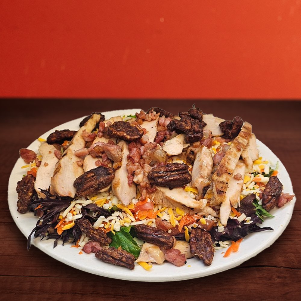Romaine, Petite Red & Green Lettuce, Candied Pecans, Grilled Chicken Breast, Real Bacon Bits, tomato, shredded carrot & Mixed Cheese. Served with our Signature In-House Ranch on side.