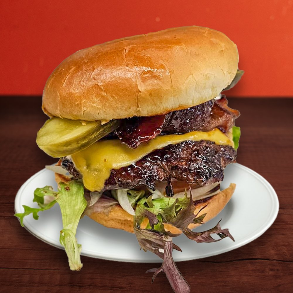 Charbroiled Patty & Double Bacon glazed in our in-house Maple BBQ Sauce, Cheddar Cheese, Petite Red & Green Lettuce, Tomato, Onion, Pickle & Mayo.