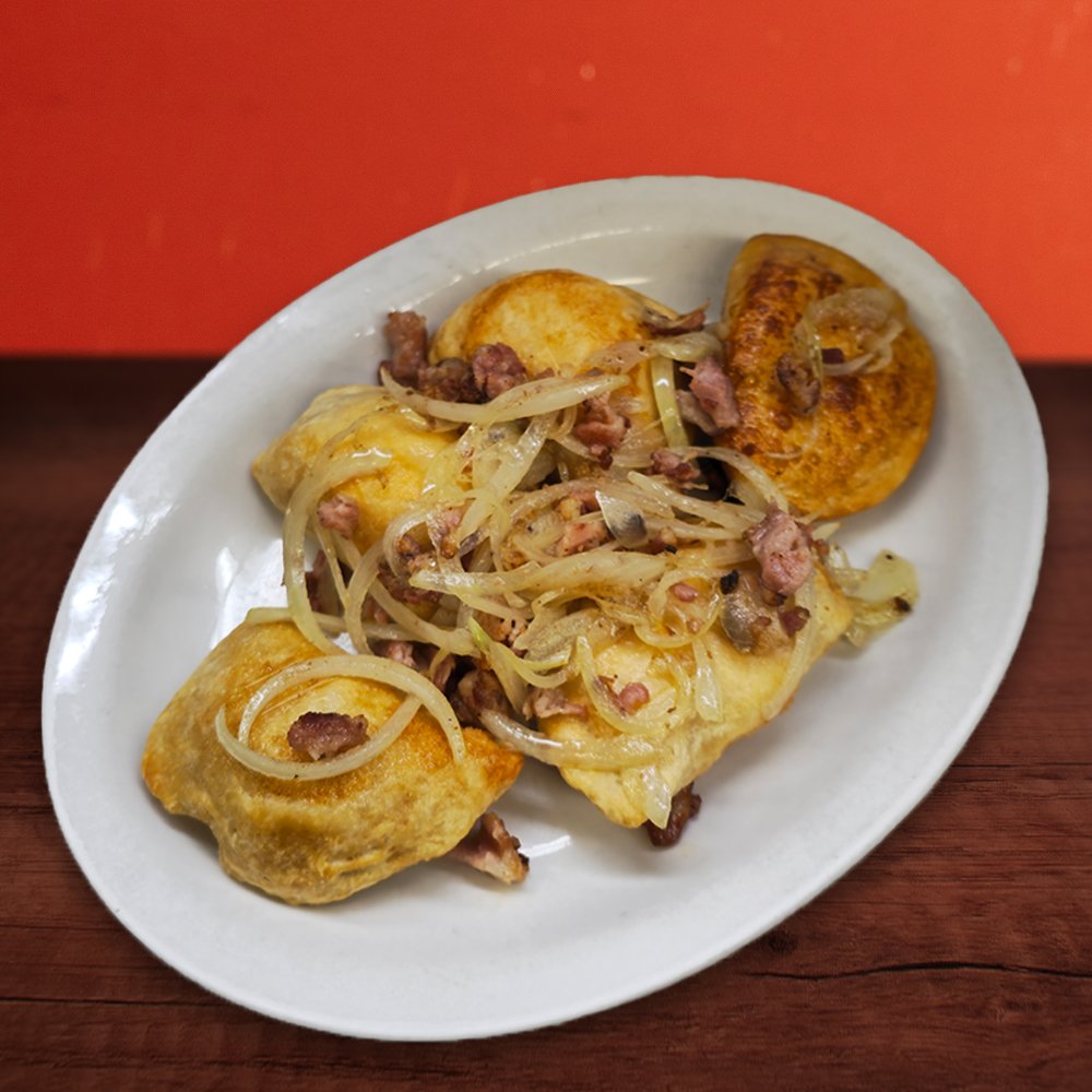 5 Potato & Cheddar perogies with sautéed onions and bacon bits.