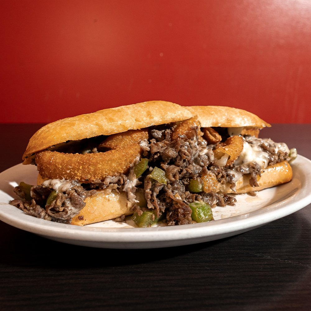 Thinly Sliced Steak, Sauteed Peppers, Gourmet Onion Ring, Melted Mozza Cheese