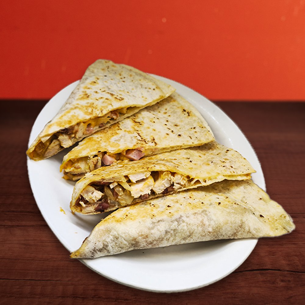 Ham, Bacon, Fried Onion, Tomato, Vous Sauce, and Mozzarella Cheese in a Grilled Tortilla