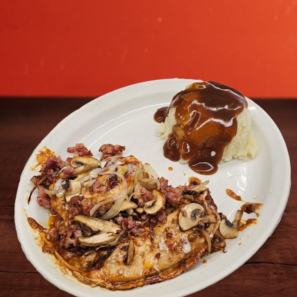 2 Charbroiled hamburger patty topped with grilled onions, mushrooms & Gravy.